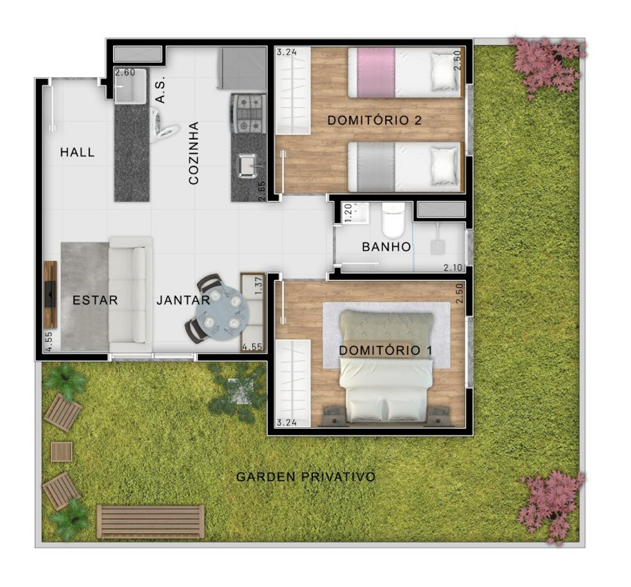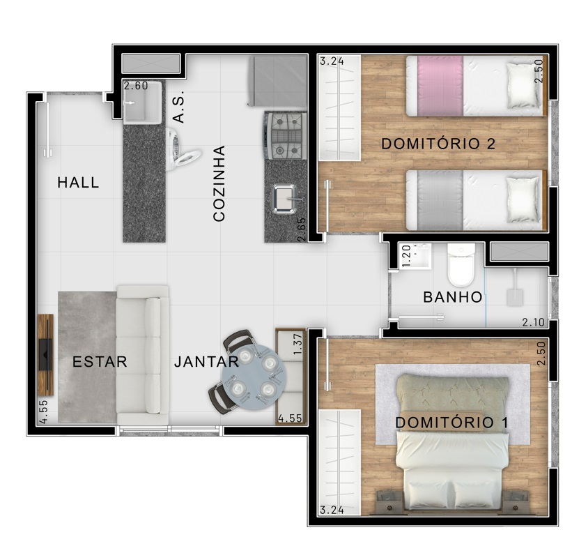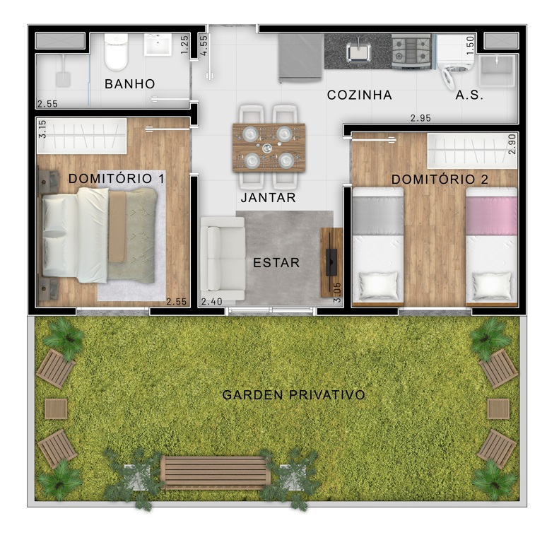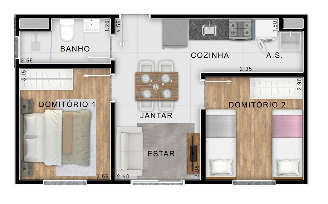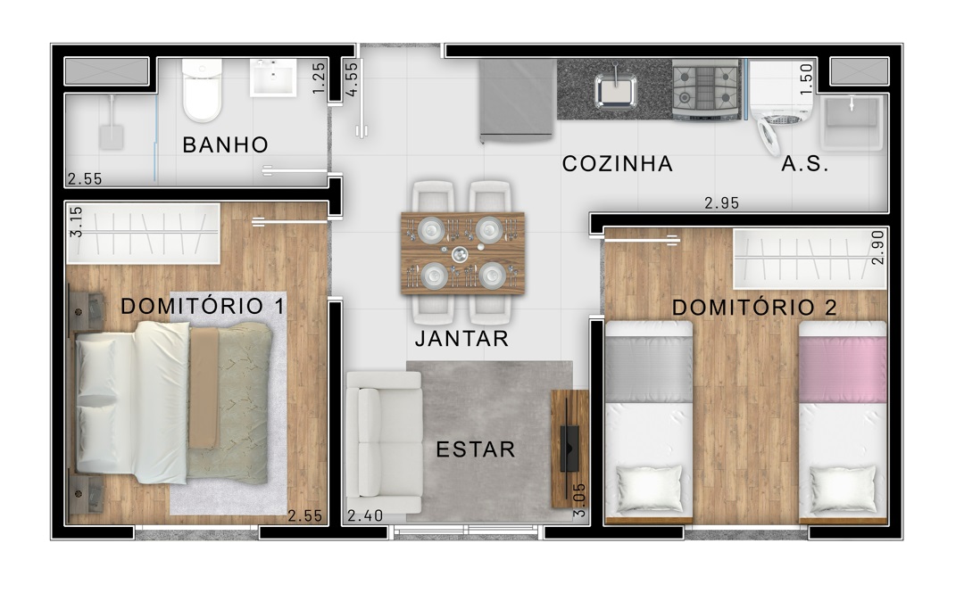 Apartamentos de 2 dormitórios com plantas que variam de 39m² a 81m², ideais para quem busca conforto, lazer e segurança para toda a família.